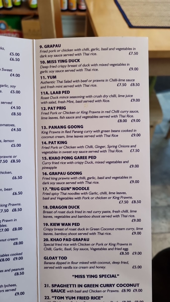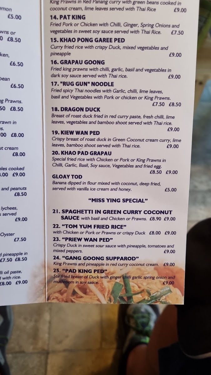 The menu invites you to explore familiar favorites like Pad Thai and Tom Yum Gai, alongside heartier options such as Dragon Duck or the Miss Ying Special—spaghetti served in a rich green curry coconut sauce. Small plates and starters like Satay Chicken or Crab Rangoon provide perfect bites to share, while sweet treats such as Fried Banana and Banana Fritters offer a gentle finish to the meal.